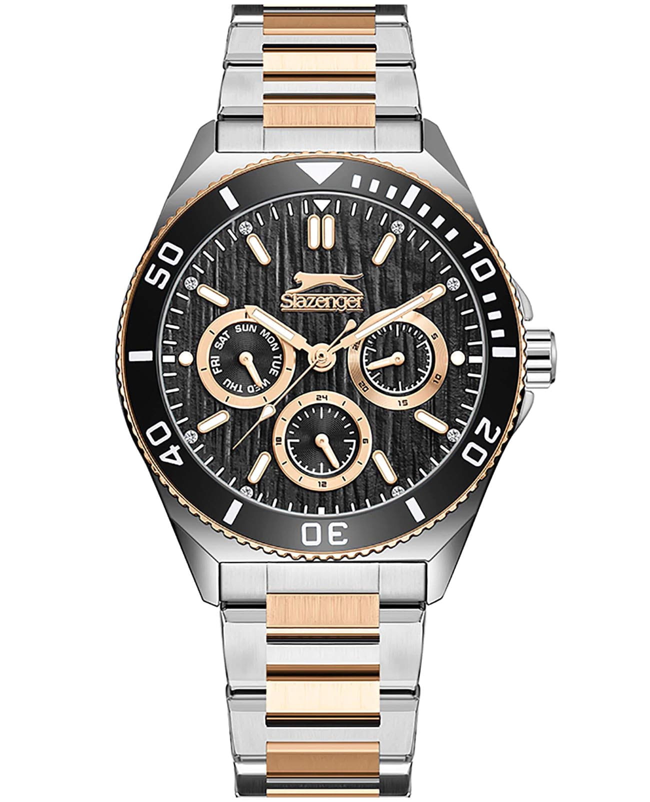 Женские кварцевые часы Slazenger SL.09.2371.2.04 – это сочетание элегантности, современного стиля и надёжности. Изящный корпус из суперметалла серебристого цвета, диаметром 38.5 мм и толщиной 11 мм, подчёркивает утончённость модели и делает их идеальным аксессуаром для любой ситуации – будь то деловая встреча, романтический вечер или повседневные выходы. Циферблат надёжно защищён минеральным стекломМинеральное стеклоМинеральное стекло представляет собой искусственно выращенный минерал кварца. Такое стекло отличается особой устойчивостью к повреждениям и царапинам. Уступает по некоторым качествам сапфировому стеклу., которое устойчиво к механическим повреждениям и сохраняет кристальную прозрачность. БезельБезельВнешний ободок, закрепляющий стекло. В спортивных часах так называется поворотное кольцо с делениями на циферблате, выполняет роль таймера – замеряет отрезки времени на шкале. Неподвижный безель – элемент декора. Однонаправленно вращающийся безель на дайверских часах позволяет фиксировать моменты погружения и выныривания на поверхность. с IP-покрытиемIP-покрытиеМетод ионного напыления. Демонстрирует повышенную устойчивость к истиранию, окислению и химическим веществам. Под воздействием высокого давления и температуры около 1500°C молекулы металла надёжно соединяются с частицами корпуса часов. черного цвета. Браслет из суперметалла с частичным IP-покрытиемIP-покрытиеМетод ионного напыления. Демонстрирует повышенную устойчивость к истиранию, окислению и химическим веществам. Под воздействием высокого давления и температуры около 1500°C молекулы металла надёжно соединяются с частицами корпуса часов. удобно облегает запястье и фиксируется с помощью раскладной застёжкиРаскладная застёжкаТакой тип застёжки используется только на браслетах из металла. Она никогда не раскрывается полностью, происходит разделение на 2 и более частей. Раскладывающая застёжка снизит вероятность потери часов к минимуму., обеспечивая надёжность и комфорт в повседневном ношении. Утончённый стиль, внимание к деталям и практичность делают эту модель идеальным выбором для современных женщин, ценящих эстетику и функциональность. Стрелки и метки покрыты люминесцентным покрытиемЛюминесцентное покрытиеПозволяет считывать показания времени в темноте. Производители наносят на стрелки, часовые индексы, безель или поверхность циферблата светонакопительный состав, дающий холодное свечение., обеспечивающим отличную читаемость в темноте. Вынесенный циферблат с 24-х часовым указателем времени украшен фианитами. Водозащита до 30 метров позволит защитить корпус от случайных брызг или капель дождя.