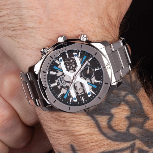 Мужские кварцевые часы Slazenger — это выразительный и функциональный аксессуар. Корпус диаметром 44 мм и толщиной 12 мм выполнен из суперметалла. Циферблат чёрного цвета с голубыми элементами частично скелетонизирован. Циферблат защищён минеральным стекломМинеральное стеклоМинеральное стекло представляет собой искусственно выращенный минерал кварца. Такое стекло отличается особой устойчивостью к повреждениям и царапинам. Уступает по некоторым качествам сапфировому стеклу.. Механизм — кварцевый калибр VX9JE1. Часы оснащены индикацией дня недели, даты и 12/24-часового формата времени. Часы оснащены браслетом из суперметалла с раскладной застёжкойРаскладная застёжкаТакой тип застёжки используется только на браслетах из металла. Она никогда не раскрывается полностью, происходит разделение на 2 и более частей. Раскладывающая застёжка снизит вероятность потери часов к минимуму.. Водонепроницаемость 50 м позволяет использовать часы в повседневных условиях. Гарантия — 12 месяцев. Идеальный выбор для тех, кто ценит стиль, функциональность и качество.