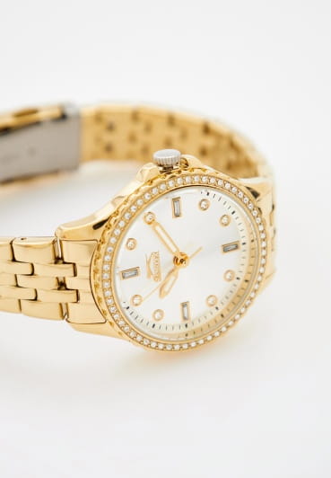 Женские кварцевые часы Slazenger SL.09.6536.3.02 – это сочетание элегантности, современного стиля и надёжности. Изящный корпус из суперметалла с IP-покрытиемIP-покрытиеМетод ионного напыления. Демонстрирует повышенную устойчивость к истиранию, окислению и химическим веществам. Под воздействием высокого давления и температуры около 1500°C молекулы металла надёжно соединяются с частицами корпуса часов. золотистого цвета, диаметром 35 мм и толщиной 8.5 мм, подчёркивает утончённость модели и делает их идеальным аксессуаром для любой ситуации – будь то деловая встреча, романтический вечер или повседневные выходы. Циферблат надёжно защищён минеральным стекломМинеральное стеклоМинеральное стекло представляет собой искусственно выращенный минерал кварца. Такое стекло отличается особой устойчивостью к повреждениям и царапинам. Уступает по некоторым качествам сапфировому стеклу., которое устойчиво к механическим повреждениям и сохраняет кристальную прозрачность. БезельБезельВнешний ободок, закрепляющий стекло. В спортивных часах так называется поворотное кольцо с делениями на циферблате, выполняет роль таймера – замеряет отрезки времени на шкале. Неподвижный безель – элемент декора. Однонаправленно вращающийся безель на дайверских часах позволяет фиксировать моменты погружения и выныривания на поверхность. украшен фианитами. Браслет из суперметалла с IP-покрытиемIP-покрытиеМетод ионного напыления. Демонстрирует повышенную устойчивость к истиранию, окислению и химическим веществам. Под воздействием высокого давления и температуры около 1500°C молекулы металла надёжно соединяются с частицами корпуса часов. удобно облегает запястье и фиксируется с помощью раскладной застёжкиРаскладная застёжкаТакой тип застёжки используется только на браслетах из металла. Она никогда не раскрывается полностью, происходит разделение на 2 и более частей. Раскладывающая застёжка снизит вероятность потери часов к минимуму., обеспечивая надёжность и комфорт в повседневном ношении. Стрелки покрыты люминесцентным покрытиемЛюминесцентное покрытиеПозволяет считывать показания времени в темноте. Производители наносят на стрелки, часовые индексы, безель или поверхность циферблата светонакопительный состав, дающий холодное свечение., обеспечивающим отличную читаемость в темноте. Утончённый стиль, внимание к деталям и практичность делают эту модель идеальным выбором для современных женщин, ценящих эстетику и функциональность. Водозащита до 30 метров позволит защитить корпус от случайных брызг или капель дождя.