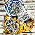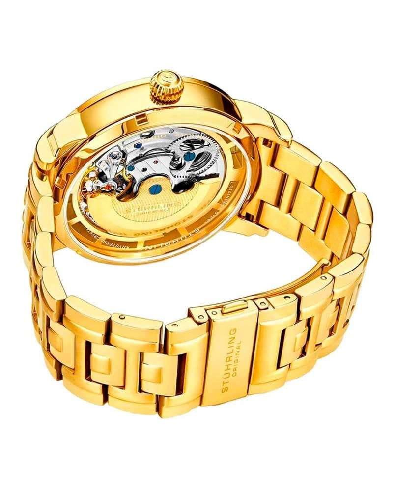 Мужские наручные часы Stührling Original 371B.03 из коллекции Luciano Automatic Skeleton сочетают в себе классический дизайн и современные технологии . Модель оснащена механическим механизмом с автоподзаводом, что гарантирует точность хода без необходимости ручного завода . Корпус часов диаметром 47 мм изготовлен из нержавеющей стали с PVD-покрытиемPVDУльтратонкое покрытие наносится в технике вакуумного напыления, сочетает в себе нитрид титана особой прочности со слоем золота или оксида хрома. Несёт в себе декоративную или защитную функцию. под золото, что подчеркивает элегантность модели . Защиту циферблата обеспечивает прочное стекло KrysternaKrysternaKrysterna — инновационное стекло для наручных часов. Благодаря уникальной структуре, Krysterna объединяет ключевые преимущества двух материалов: твердость сапфира, защищающую от царапин, и гибкость минерального стекла, обеспечивающую устойчивость к деформациям. Такая комбинация делает его идеальным решением для часов, подверженных экстремальным нагрузкам, сохраняя при этом оптическую прозрачность., известное своей устойчивостью к царапинам и механическим повреждениям . Циферблат выполнен в стиле , что позволяет наблюдать за работой внутреннего механизма и демонстрирует сложность инженерного решения . Такой дизайн делает модель не только функциональной, но и стильной, привлекая внимание ценителей сложных технических решений. Браслет из того же материала на раскладной застёжкеРаскладная застёжкаТакой тип застёжки используется только на браслетах из металла. Она никогда не раскрывается полностью, происходит разделение на 2 и более частей. Раскладывающая застёжка снизит вероятность потери часов к минимуму.. Водонепроницаемость модели достигает 5 атмосфер (50 метров), что позволяет использовать их в повседневных условиях, включая контакт с водой, например, при мытье рук или дожде . Заводная головка с системой завинчивания обеспечивает дополнительную защиту механизма от внешних воздействий.