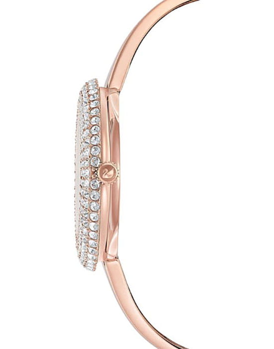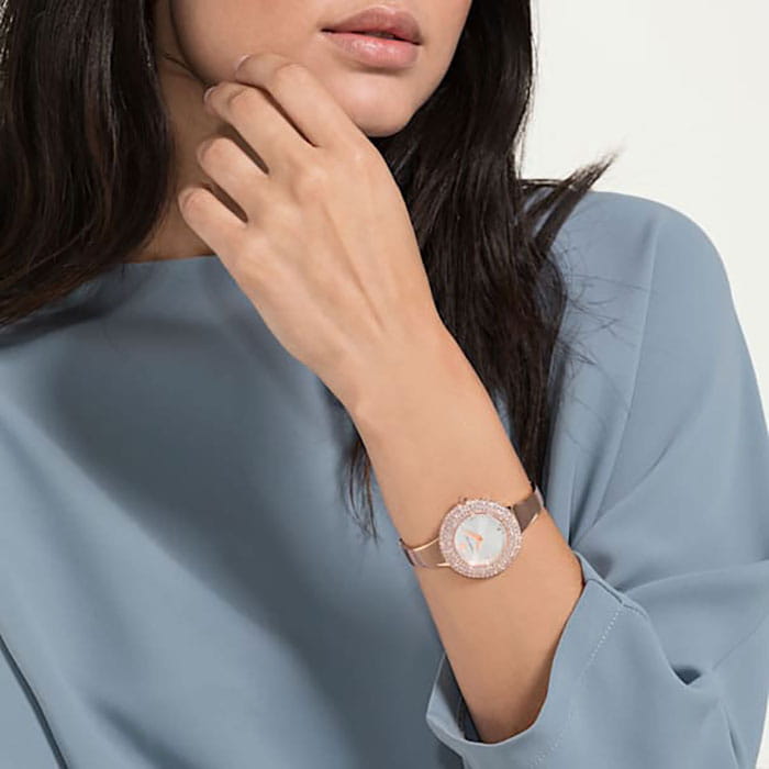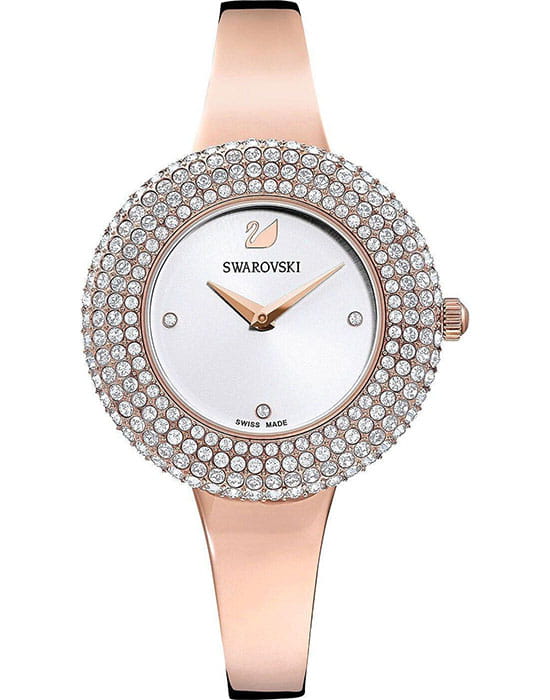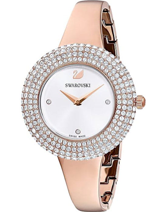 Женские часы Swarovski Crystal Rose 5484073 – это элегантные и утончённые часы, отличающиеся непревзойдённым сиянием.  БезельБезельВнешний ободок, закрепляющий стекло. В спортивных часах так называется поворотное кольцо с делениями на циферблате, выполняет роль таймера – замеряет отрезки времени на шкале. Неподвижный безель – элемент декора. Однонаправленно вращающийся безель на дайверских часах позволяет фиксировать моменты погружения и выныривания на поверхность. украшен микропаве из 215 кристаллов. Завершающие штрихи уникального дизайна – корпус и браслет из нержавеющей стали с PVDPVDУльтратонкое покрытие наносится в технике вакуумного напыления, сочетает в себе нитрид титана особой прочности со слоем золота или оксида хрома. Несёт в себе декоративную или защитную функцию. покрытием оттенка розового золота и белый циферблат с рисунком в виде солнечных лучей и тремя метками из прозрачных кристаллов. Надежное минеральное стеклоМинеральное стеклоМинеральное стекло представляет собой искусственно выращенный минерал кварца. Такое стекло отличается особой устойчивостью к повреждениям и царапинам. Уступает по некоторым качествам сапфировому стеклу. защищает часы от царапин и долго сохраняет первоначальный внешний вид. Водозащита 50 метров делает часы практичными для повседневного использования.