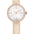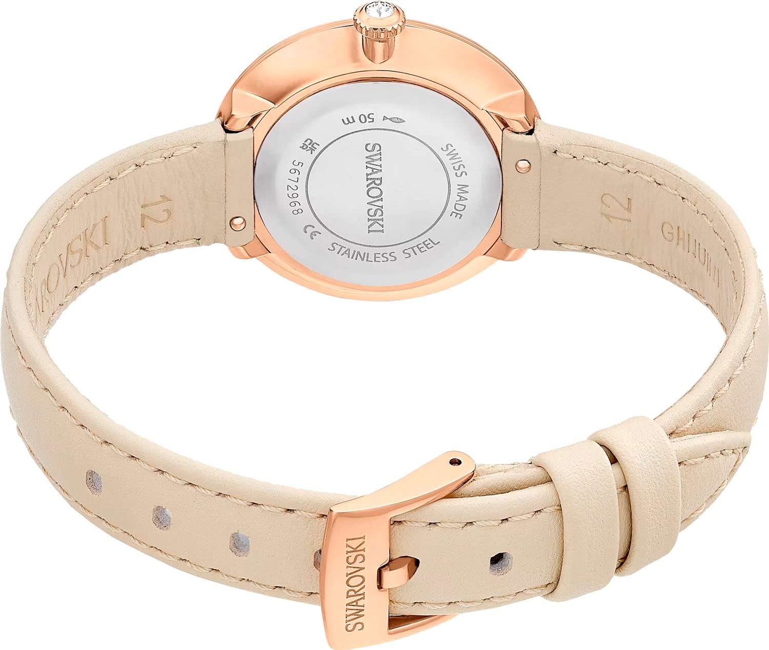 Часы Swarovski 5672968 – это воплощение изысканного дизайна и функциональности, созданное для тех, кто ценит красоту и точность. Стальной круглый корпус имеет красивую отделку PVDPVDУльтратонкое покрытие наносится в технике вакуумного напыления, сочетает в себе нитрид титана особой прочности со слоем золота или оксида хрома. Несёт в себе декоративную или защитную функцию. покрытием оттенка розового золота и оснащен безелемБезельВнешний ободок, закрепляющий стекло. В спортивных часах так называется поворотное кольцо с делениями на циферблате, выполняет роль таймера – замеряет отрезки времени на шкале. Неподвижный безель – элемент декора. Однонаправленно вращающийся безель на дайверских часах позволяет фиксировать моменты погружения и выныривания на поверхность., украшенным паве из тридцати мерцающих кристаллов. Под минеральным стекломМинеральное стеклоМинеральное стекло представляет собой искусственно выращенный минерал кварца. Такое стекло отличается особой устойчивостью к повреждениям и царапинам. Уступает по некоторым качествам сапфировому стеклу. открывается белый циферблат дополненный логотипом Swarovski в виде лебедя на 12 часах и кристаллами на отметках 3, 6 и 9 часов. Отсутствие секундной стрелки подчеркивает минимализм и утонченность дизайна. Рифленая заводная головка также украшена сверкающим кристаллом круглой огранки. Ремешок из натуральной итальянской телячьей кожи бежевого цвета с классической застежкой с логотипом Swarovski. Водозащита 50WR делает их устойчивыми к влаге, позволяя наслаждаться стильным аксессуаром в любых условиях.