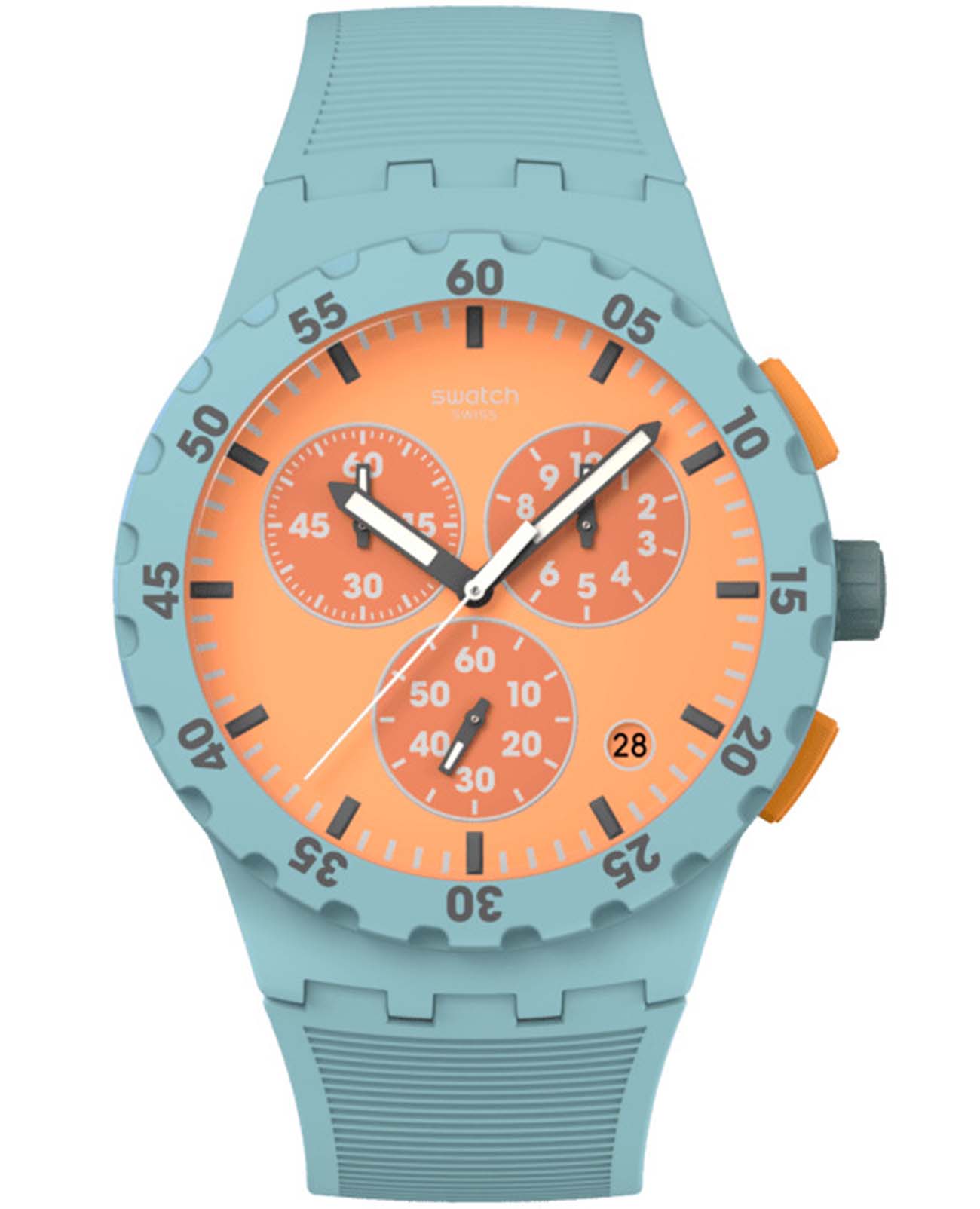 Часы Swatch SUSL401 — это стильный и современный аксессуар для тех, кто ценит лёгкость и комфорт. Часы идеально подойдут как для мужчин, так и для женщин. Этот хронографХронографФункция позволяет измерять отрезки времени с особой точностью: часы, минуты, секунды. Верным признаком хронографа является наличие на циферблате 3 дополнительных окошек-счётчиков. привлекает внимание светло-оранжевым циферблатом с темно-оранжевыми дополнительными циферблатами, темно-зелёными светящимися в темноте благодаря люминесцентному покрытиюЛюминесцентное покрытиеПозволяет считывать показания времени в темноте. Производители наносят на стрелки, часовые индексы, безель или поверхность циферблата светонакопительный состав, дающий холодное свечение. часовой, минутной и вспомогательной стрелками, белой секундной стрелкой и окошком указателем даты в положении между «4» и «5» часами. Матовый светло-зелёный корпус располагает безелемБезельВнешний ободок, закрепляющий стекло. В спортивных часах так называется поворотное кольцо с делениями на циферблате, выполняет роль таймера – замеряет отрезки времени на шкале. Неподвижный безель – элемент декора. Однонаправленно вращающийся безель на дайверских часах позволяет фиксировать моменты погружения и выныривания на поверхность. с темно-зелёным принтом и разноцветной заводной головкой и кнопками. Его дополняет текстурный матовый светло-зелёный ремешок с тренчиком и пряжкой в тон. На фактурном бирюзовом ремешке контрастно выделяются полупрозрачные тренчики желтого и оранжевого цвета и синяя пряжка. Водозащита 30 метров делает часы практичными для повседневного использования. Эти часы подойдут для повседневного ношения и станут ярким акцентом в вашем наряде.