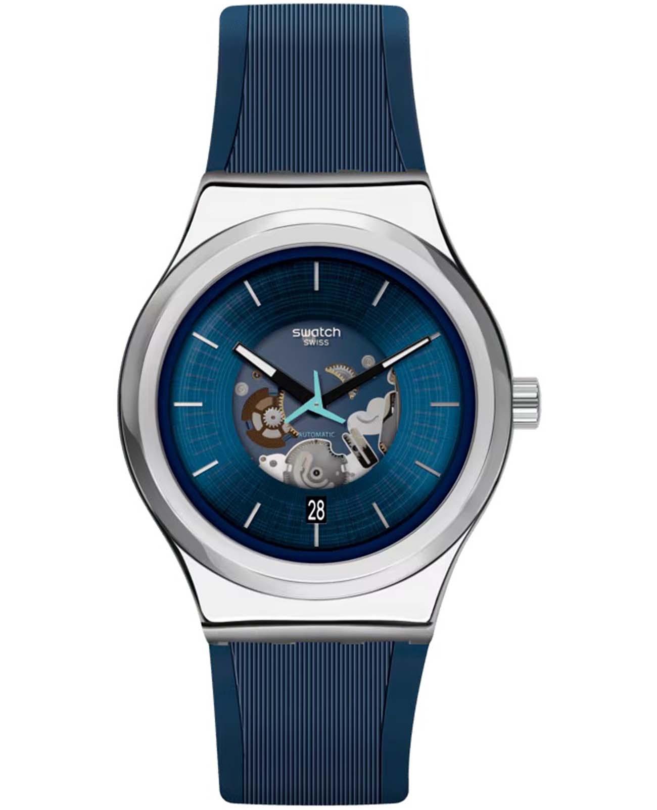 Часы Swatch YIS430 — это стильный и современный аксессуар для тех, кто ценит надежность и комфорт. Эти механические часы имеют синий циферблат радиальной полировкой и прозрачной вставкой. Стрелки с люминесцентным покрытиемЛюминесцентное покрытиеПозволяет считывать показания времени в темноте. Производители наносят на стрелки, часовые индексы, безель или поверхность циферблата светонакопительный состав, дающий холодное свечение.. Секундная стрелка необычной формы и бирюзового цвета. Окошко календаря расположено в положении 3 часов. Блестящий корпус из нержавеющей стали, а через заднюю крышку с цифровым принтом просматривается механизм SISTEM51. Модель оснащена автоматическим механизмом Sistem51, который состоит всего из 51 детали и имеет запас хода 90 часов.  Дополняет модель матовый синий ремешок из резины с классической застежкой. Водозащита 30 метров позволяет защитить корпус от случайных брызг или капель дождя, что делает часы практичными для повседневного использования. Эти часы станут ярким акцентом в вашем образе.