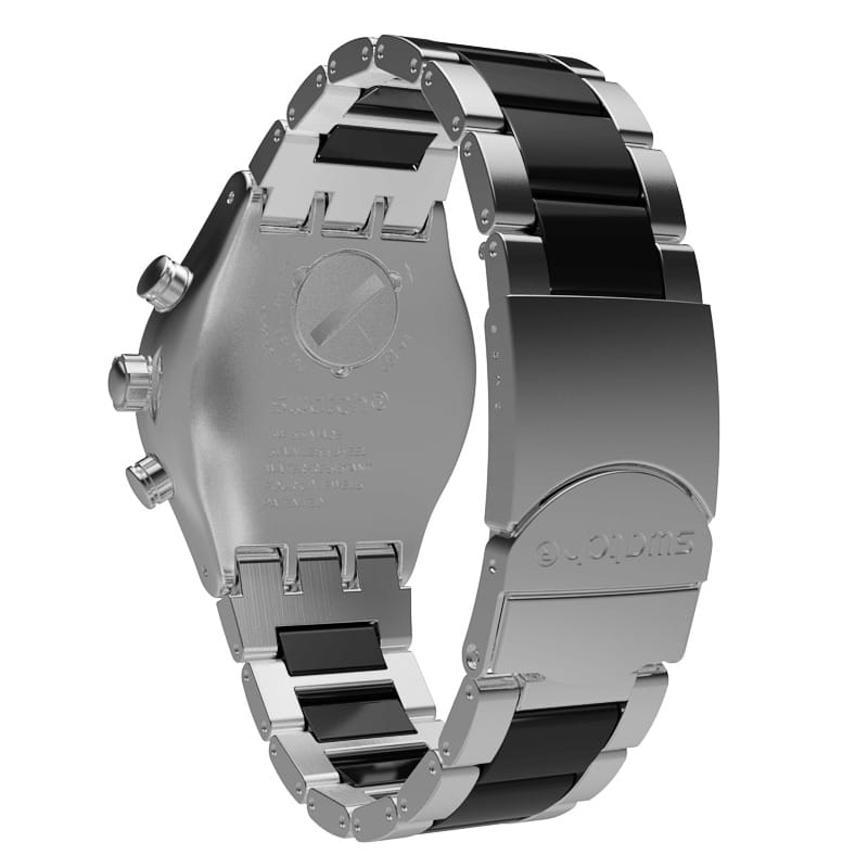 Часы Swatch YVS441G — это стильный и современный аксессуар для тех, кто ценит лёгкость и комфорт. Этот стильный хронографХронографФункция позволяет измерять отрезки времени с особой точностью: часы, минуты, секунды. Верным признаком хронографа является наличие на циферблате 3 дополнительных окошек-счётчиков. революция стиля, ведь в ней изящно сочетаются спортивный дух и подчеркнутая элегантность. Эти часы оснащены черным циферблатом с радиальной полировкой и белым принтом, а также окошком даты в положении «4:30» и стрелками с люминесцентным покрытиемЛюминесцентное покрытиеПозволяет считывать показания времени в темноте. Производители наносят на стрелки, часовые индексы, безель или поверхность циферблата светонакопительный состав, дающий холодное свечение.. БезельБезельВнешний ободок, закрепляющий стекло. В спортивных часах так называется поворотное кольцо с делениями на циферблате, выполняет роль таймера – замеряет отрезки времени на шкале. Неподвижный безель – элемент декора. Однонаправленно вращающийся безель на дайверских часах позволяет фиксировать моменты погружения и выныривания на поверхность. из полированной стали с черным PVDPVDУльтратонкое покрытие наносится в технике вакуумного напыления, сочетает в себе нитрид титана особой прочности со слоем золота или оксида хрома. Несёт в себе декоративную или защитную функцию. покрытием имеет гравировку, выполненную белой эмалью, и помещен в корпус из полированной нержавеющей стали. Регулируемый браслет с раскладной застёжкойРаскладная застёжкаТакой тип застёжки используется только на браслетах из металла. Она никогда не раскрывается полностью, происходит разделение на 2 и более частей. Раскладывающая застёжка снизит вероятность потери часов к минимуму., напоминающий длинную черную гоночную трассу, изготовлен из нержавеющей стали со звеньями из черного каучука. Водозащита 30 метров делает часы практичными для повседневного использования. Эти часы подойдут для повседневного ношения и станут ярким акцентом в вашем наряде.