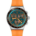 Часы Swatch YVS529 — это стильный и современный аксессуар для тех, кто ценит лёгкость и комфорт. Этот хронографХронографФункция позволяет измерять отрезки времени с особой точностью: часы, минуты, секунды. Верным признаком хронографа является наличие на циферблате 3 дополнительных окошек-счётчиков. из нержавеющей стали имеет синий циферблат с оранжевым принтом. Часовая и минутная стрелки серебристой расцветки, а также синяя секундная стрелка светятся в темноте из-за люминесцентного покрытияЛюминесцентное покрытиеПозволяет считывать показания времени в темноте. Производители наносят на стрелки, часовые индексы, безель или поверхность циферблата светонакопительный состав, дающий холодное свечение.. Часы заключены в матовый стальной корпус, оснащены стальным безелемБезельВнешний ободок, закрепляющий стекло. В спортивных часах так называется поворотное кольцо с делениями на циферблате, выполняет роль таймера – замеряет отрезки времени на шкале. Неподвижный безель – элемент декора. Однонаправленно вращающийся безель на дайверских часах позволяет фиксировать моменты погружения и выныривания на поверхность. с черным PVDPVDУльтратонкое покрытие наносится в технике вакуумного напыления, сочетает в себе нитрид титана особой прочности со слоем золота или оксида хрома. Несёт в себе декоративную или защитную функцию. покрытием и шкалой тахиметраТахиметрРазмеченная шкала, располагается на ободке или безеле часов. Тахиметр позволяет рассчитать скорость на определённом участке пути, расстояние измеряется в километрах или милях.. Модель дополнена броским оранжевым ремешком с тренчиками в тон и блестящей стальной полупряжкой. Водозащита 30 метров делает часы практичными для повседневного использования. Эти часы подойдут для повседневного ношения и станут ярким акцентом в вашем наряде.