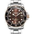 Мужские механические часы с автоподзаводом Swiss Military Hanowa из коллекции Sealord — это профессиональный аксессуар для дайвинга и повседневного ношения. Корпус диаметром 41 мм и толщиной выполнен из нержавеющей стали 316L. БезельБезельВнешний ободок, закрепляющий стекло. В спортивных часах так называется поворотное кольцо с делениями на циферблате, выполняет роль таймера – замеряет отрезки времени на шкале. Неподвижный безель – элемент декора. Однонаправленно вращающийся безель на дайверских часах позволяет фиксировать моменты погружения и выныривания на поверхность. изготовлен из высокотехнологичной керамики чёрного цвета. Циферблат коричневого цвета оформлен индексами и стрелками. Окошко даты расположено в положении 3 часов, увеличенное лупой (Cyclops). Стрелки и метки с люминесцентным покрытиемЛюминесцентное покрытиеПозволяет считывать показания времени в темноте. Производители наносят на стрелки, часовые индексы, безель или поверхность циферблата светонакопительный состав, дающий холодное свечение., обеспечивающим хорошую читаемость в темноте. Циферблат защищён сапфировым стекломСапфировое стеклоПрочный и надёжный материал из кристалла сапфира синтетического происхождения, характеризующийся особой твёрдостью и устойчивостью к царапинам и повреждениям. с антибликовым покрытиемАнтибликовое покрытиеСлой оксида металла в 0,13-0,3 микрон, благодаря которому стекло часов не бликует и не отражает свет. Антибликовое покрытие уменьшает отражение света в 10 раз, обеспечивая отличную читаемость показателей циферблата.. Механизм — автоматический швейцарский калибр Soprod P024 (на базе ETA 2824) с запасом хода до 38 часов. Прозрачная задняя крышка позволяет наблюдать за работой механизма. Завинчивающаяся заводная головка обеспечивает повышенную водонепроницаемость. Часы оснащены стальным браслетом на раскладной застёжкеРаскладная застёжкаТакой тип застёжки используется только на браслетах из металла. Она никогда не раскрывается полностью, происходит разделение на 2 и более частей. Раскладывающая застёжка снизит вероятность потери часов к минимуму. с кнопочным фиксатором. Водонепроницаемость 200 м позволяет использовать часы для плавания и дайвинга. Идеальный выбор для тех, кто ценит швейцарское качество и надёжность.