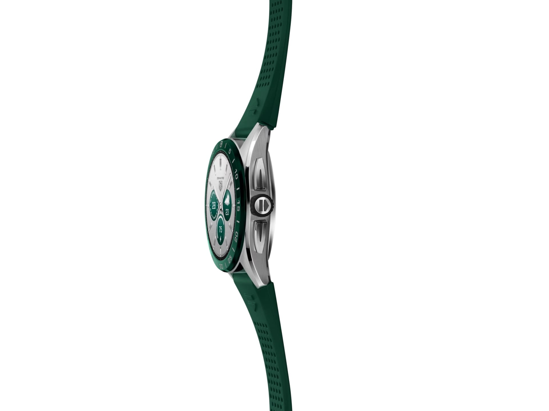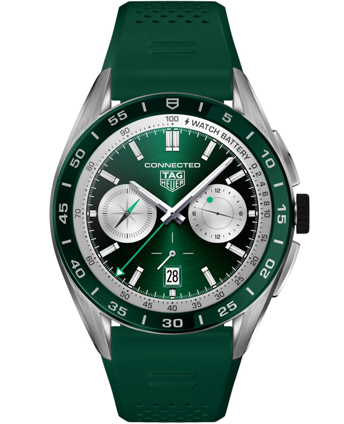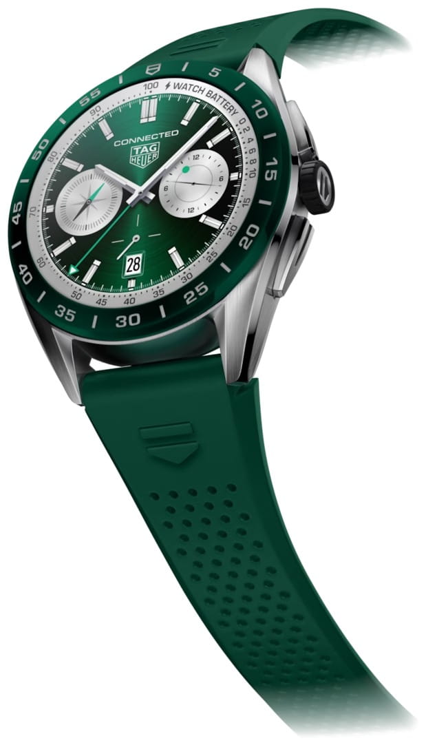 Лимитированные швейцарские смарт-часы TAG Heuer Connected SBR8A14.BT6317, оснащенные передовыми технологиями. Класс водозащиты: 50 метров, позволит защитить корпус от случайных брызг или капель дождя. Корпус часов изготовлен из нержавеющей стали. Неподвижный безельБезельВнешний ободок, закрепляющий стекло. В спортивных часах так называется поворотное кольцо с делениями на циферблате, выполняет роль таймера – замеряет отрезки времени на шкале. Неподвижный безель – элемент декора. Однонаправленно вращающийся безель на дайверских часах позволяет фиксировать моменты погружения и выныривания на поверхность. из керамики. Ремешок из каучука с раскладной застёжкойРаскладная застёжкаТакой тип застёжки используется только на браслетах из металла. Она никогда не раскрывается полностью, происходит разделение на 2 и более частей. Раскладывающая застёжка снизит вероятность потери часов к минимуму.. В комплект входит зарядная док-станция с кабелем USB-C и блоком питания.