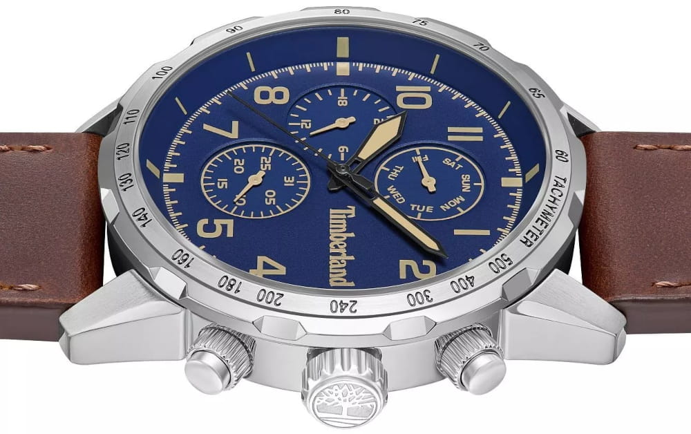 Американские мужские часы-хронографХронографФункция позволяет измерять отрезки времени с особой точностью: часы, минуты, секунды. Верным признаком хронографа является наличие на циферблате 3 дополнительных окошек-счётчиков. c тахиметромТахиметрРазмеченная шкала, располагается на ободке или безеле часов. Тахиметр позволяет рассчитать скорость на определённом участке пути, расстояние измеряется в километрах или милях. Timberland TDWGF0055401 — это сочетание надежности, функциональности и уверенного стиля. Модель идеально подойдет для тех, кто ценит точность и выносливость в каждой детали. Часы оснащены кварцевым механизмом , гарантирующим высокую точность хода и минимальное обслуживание. В конструкции использовано прочное минеральное стеклоМинеральное стеклоМинеральное стекло представляет собой искусственно выращенный минерал кварца. Такое стекло отличается особой устойчивостью к повреждениям и царапинам. Уступает по некоторым качествам сапфировому стеклу., устойчивое к мелким повреждениям и долговечное в использовании. Корпус выполнен из нержавеющей стали, что обеспечивает стойкость к царапинам и длительный срок службы без потери внешнего вида. Стрелки часов имеют люминесцентное покрытиеЛюминесцентное покрытиеПозволяет считывать показания времени в темноте. Производители наносят на стрелки, часовые индексы, безель или поверхность циферблата светонакопительный состав, дающий холодное свечение., позволяющее считывать время даже в условиях слабого освещения. Дизайн дополнен кожаным ремешком с классической застежкой и системой быстрой замены , что делает использование часов максимально удобным и комфортным при ежедневной носке. Класс водозащиты WR50 позволяет использовать часы в повседневных условиях, включая мытьё рук или прогулки под дождем.