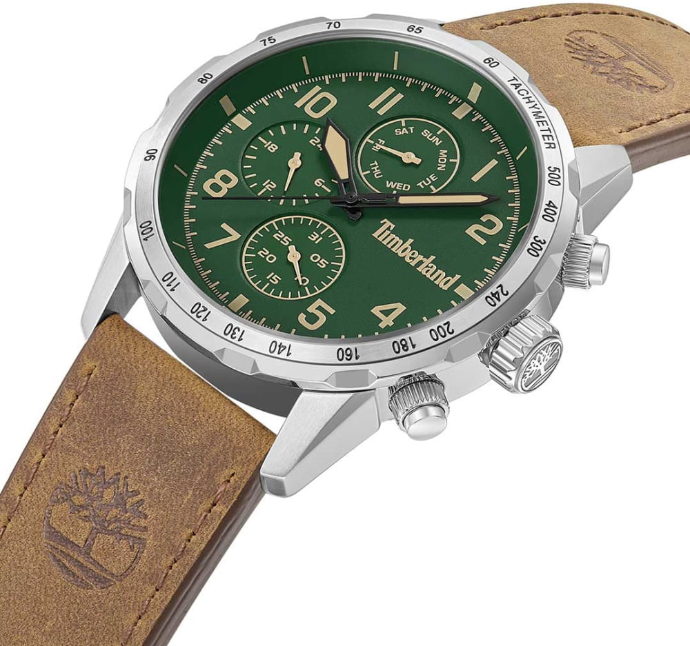 Американские мужские часы-хронографХронографФункция позволяет измерять отрезки времени с особой точностью: часы, минуты, секунды. Верным признаком хронографа является наличие на циферблате 3 дополнительных окошек-счётчиков. c тахиметромТахиметрРазмеченная шкала, располагается на ободке или безеле часов. Тахиметр позволяет рассчитать скорость на определённом участке пути, расстояние измеряется в километрах или милях. Timberland TDWGF0055402 — это сочетание надежности, функциональности и уверенного стиля. Модель идеально подойдет для тех, кто ценит точность и выносливость в каждой детали. Часы оснащены кварцевым механизмом , гарантирующим высокую точность хода и минимальное обслуживание. В конструкции использовано прочное минеральное стеклоМинеральное стеклоМинеральное стекло представляет собой искусственно выращенный минерал кварца. Такое стекло отличается особой устойчивостью к повреждениям и царапинам. Уступает по некоторым качествам сапфировому стеклу., устойчивое к мелким повреждениям и долговечное в использовании. Корпус выполнен из нержавеющей стали, что обеспечивает стойкость к царапинам и длительный срок службы без потери внешнего вида. Стрелки часов имеют люминесцентное покрытиеЛюминесцентное покрытиеПозволяет считывать показания времени в темноте. Производители наносят на стрелки, часовые индексы, безель или поверхность циферблата светонакопительный состав, дающий холодное свечение., позволяющее считывать время даже в условиях слабого освещения. Дизайн дополнен кожаным ремешком с классической застежкой и системой быстрой замены , что делает использование часов максимально удобным и комфортным при ежедневной носке. Класс водозащиты WR50 позволяет использовать часы в повседневных условиях, включая мытьё рук или прогулки под дождем.