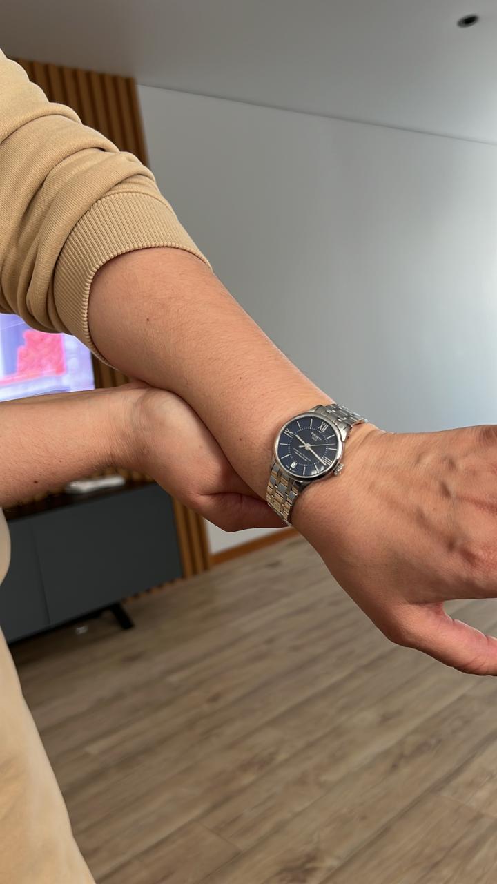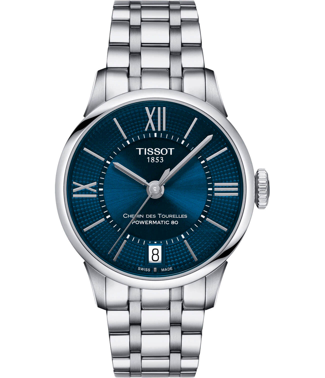 Аксессуар воплощает точность и надёжность швейцарских технологий, яркий синий циферблат с узором по окружности дополнен винтажными римскими цифрами и чёткими метками делений. Это механические часы с автоподзаводом, работают от популярного калибра Powermatic 80Powermatic 80Эксклюзивный калибр от швейцарской компании ETA с увеличенным запасом хода до 80 часов за счёт удлинённой заводной пружины. Характеризуется улучшенной системой спуска со сниженным трением. с запасом хода 80 часов. Через прозрачную крышку корпуса можно наблюдать движение его составляющих. Сапфировое стекло. Водонепроницаемость 50 метров. Индикация даты. Габариты: 32 x 32 x 10,7 мм.