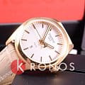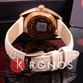 Ремешок из натуральной кожи в кремовом цвете идеально сочетается со светлым циферблатом и корпусом с PVD-покрытиемPVDУльтратонкое покрытие наносится в технике вакуумного напыления, сочетает в себе нитрид титана особой прочности со слоем золота или оксида хрома. Несёт в себе декоративную или защитную функцию. оттенка "розовое золото". Внутри заключён высокоточный кварцевый механизм ETA F04.111 с 3 камнями. Сапфировое стекло препятствует появлению царапин и отметин. Водонепроницаемость при давлении 10 бар. Люминесцентная подсветкаЛюминесцентное покрытиеПозволяет считывать показания времени в темноте. Производители наносят на стрелки, часовые индексы, безель или поверхность циферблата светонакопительный состав, дающий холодное свечение.. Апертура даты. Функция EOLEOLПредставляет собой систему, уведомляющую владельца часов о необходимости замены элемента питания. За 2 недели до полного разряда батарейки секундная стрелка перестаёт ходить чётко и начинает перепрыгивать на 3-4 деления.. Габариты: 33 x 33 x 9 мм.