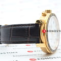 Внушительный корпус 42 мм имеет PVD-покрытиеPVDУльтратонкое покрытие наносится в технике вакуумного напыления, сочетает в себе нитрид титана особой прочности со слоем золота или оксида хрома. Несёт в себе декоративную или защитную функцию. цвета розового золота, модель сочетает в себе классические и спортивные элементы. Золотистые метки и стрелки чётко выделяются на белом фоне циферблата с миниатюрными счётчиками хронографаХронографФункция позволяет измерять отрезки времени с особой точностью: часы, минуты, секунды. Верным признаком хронографа является наличие на циферблате 3 дополнительных окошек-счётчиков.. Часы оснащены кварцевым калибром ETA G10.211 с высокой точностью хода. Сапфировое стекло. Водонепроницаемость 100 метров. Секундомер, тахиметрическая шкалаТахиметрРазмеченная шкала, располагается на ободке или безеле часов. Тахиметр позволяет рассчитать скорость на определённом участке пути, расстояние измеряется в километрах или милях., окошко даты. Габариты: 42 x 42 x 10,7 мм.