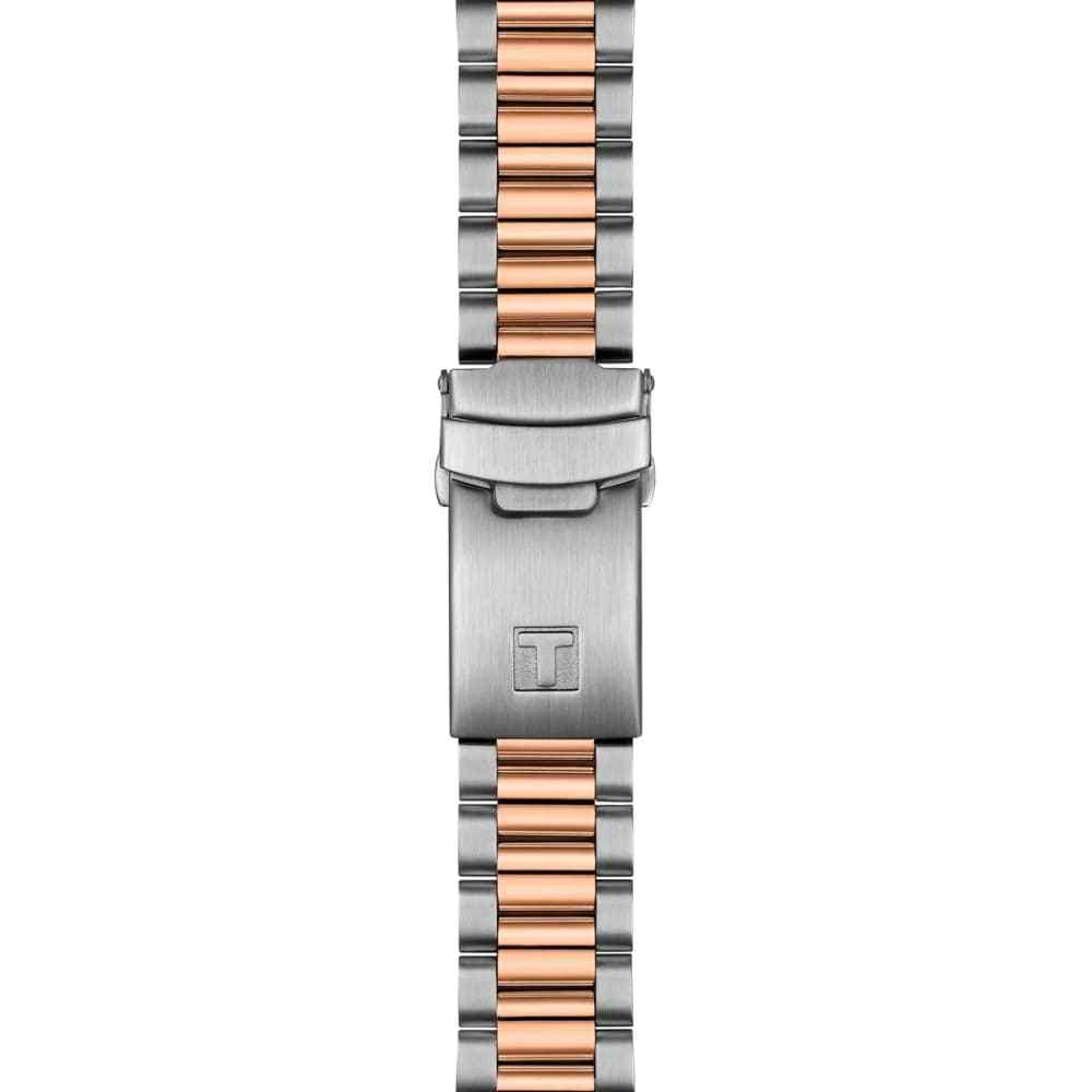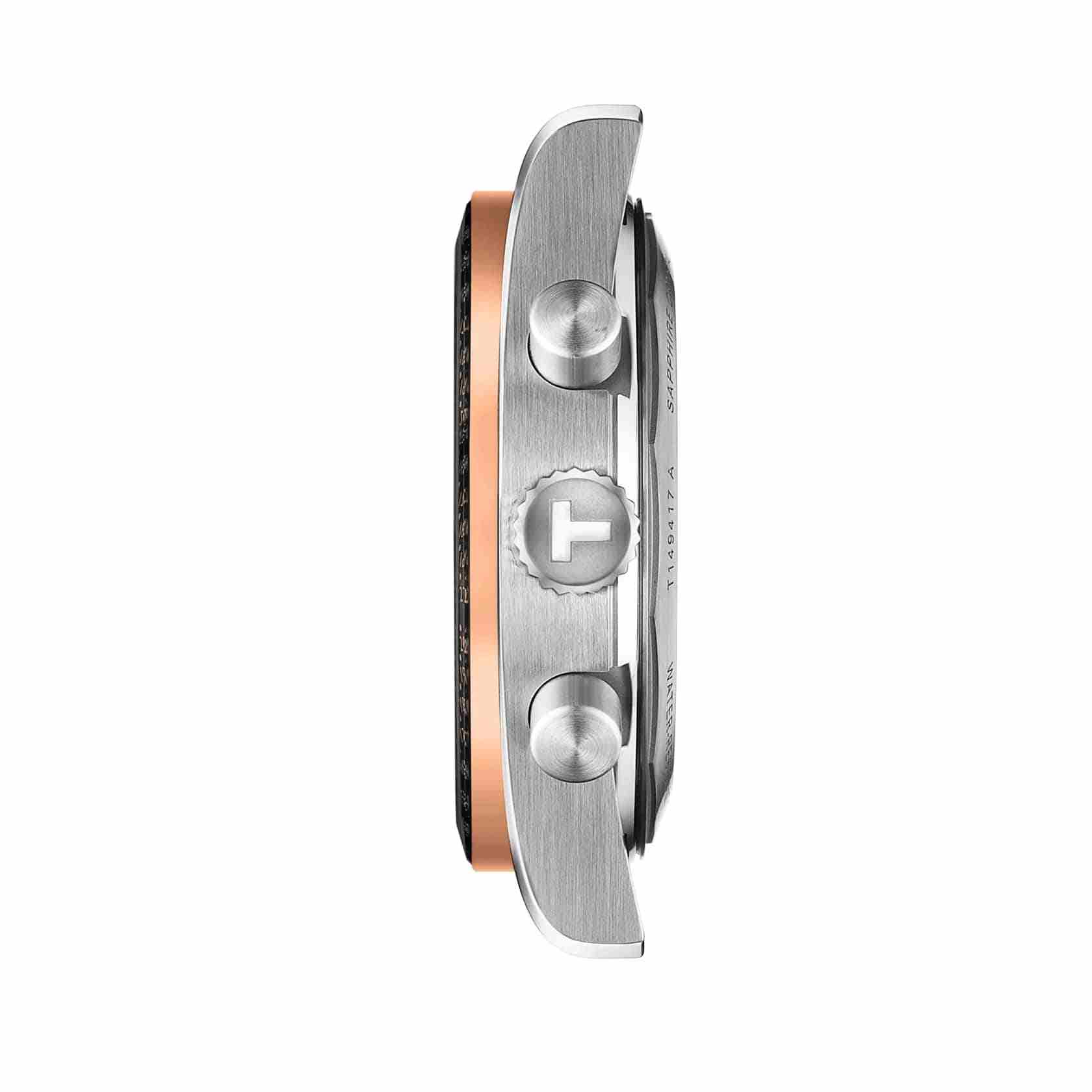 Tissot PR516 Quartz Chronograph T149.417.22.051.01 – элегантные мужские часы, вдохновлённые миром автоспорта 1960-х годов. Корпус диаметром 40 мм и толщиной 12,16 мм выполнен из нержавеющей стали 316L и безельБезельВнешний ободок, закрепляющий стекло. В спортивных часах так называется поворотное кольцо с делениями на циферблате, выполняет роль таймера – замеряет отрезки времени на шкале. Неподвижный безель – элемент декора. Однонаправленно вращающийся безель на дайверских часах позволяет фиксировать моменты погружения и выныривания на поверхность. с PVD-покрытиемPVDУльтратонкое покрытие наносится в технике вакуумного напыления, сочетает в себе нитрид титана особой прочности со слоем золота или оксида хрома. Несёт в себе декоративную или защитную функцию., придающим модели стильный и современный вид. Чёрный циферблат защищён сапфировым стекломСапфировое стеклоПрочный и надёжный материал из кристалла сапфира синтетического происхождения, характеризующийся особой твёрдостью и устойчивостью к царапинам и повреждениям. с антибликовым покрытиемАнтибликовое покрытиеСлой оксида металла в 0,13-0,3 микрон, благодаря которому стекло часов не бликует и не отражает свет. Антибликовое покрытие уменьшает отражение света в 10 раз, обеспечивая отличную читаемость показателей циферблата., обеспечивающим устойчивость к царапинам и отличную читаемость. Задняя крышка корпуса украшена гравировкой, подчёркивающей уникальность дизайна. Часы оснащены швейцарским кварцевым механизмом с функцией хронографаХронографФункция позволяет измерять отрезки времени с особой точностью: часы, минуты, секунды. Верным признаком хронографа является наличие на циферблате 3 дополнительных окошек-счётчиков., обеспечивающим высокую точность хода. Функциональность модели включает 30-минутный и 1/10-секундный счётчики, центральную 60-секундную стрелку хронографа, а также функции ADD и сплит-хронографаСплит-хронографИспользуется для измерения продолжительности нескольких временных отрезков, начинающихся одновременно, а заканчивающихся в разное время.. Индексы и стрелки покрыты люминесцентным покрытиемЛюминесцентное покрытиеПозволяет считывать показания времени в темноте. Производители наносят на стрелки, часовые индексы, безель или поверхность циферблата светонакопительный состав, дающий холодное свечение. Super-LumiNova®, обеспечивающим отличную видимость в условиях низкой освещённости. Браслет из нержавеющей стали с PVD-покрытиемPVDУльтратонкое покрытие наносится в технике вакуумного напыления, сочетает в себе нитрид титана особой прочности со слоем золота или оксида хрома. Несёт в себе декоративную или защитную функцию. розового золота оснащён системой быстрой замены и раскладной застёжкойРаскладная застёжкаТакой тип застёжки используется только на браслетах из металла. Она никогда не раскрывается полностью, происходит разделение на 2 и более частей. Раскладывающая застёжка снизит вероятность потери часов к минимуму. с предохранителем и кнопками, обеспечивающей комфортное ношение и надёжную фиксацию на запястье. Водозащита до 100 метров (10 бар) позволяет использовать часы во время плавания и других водных видов спорта.