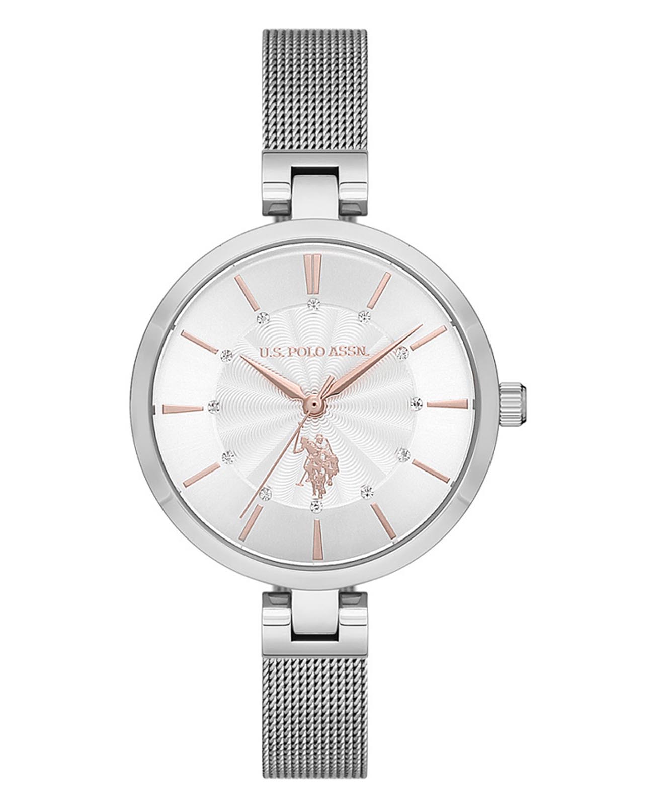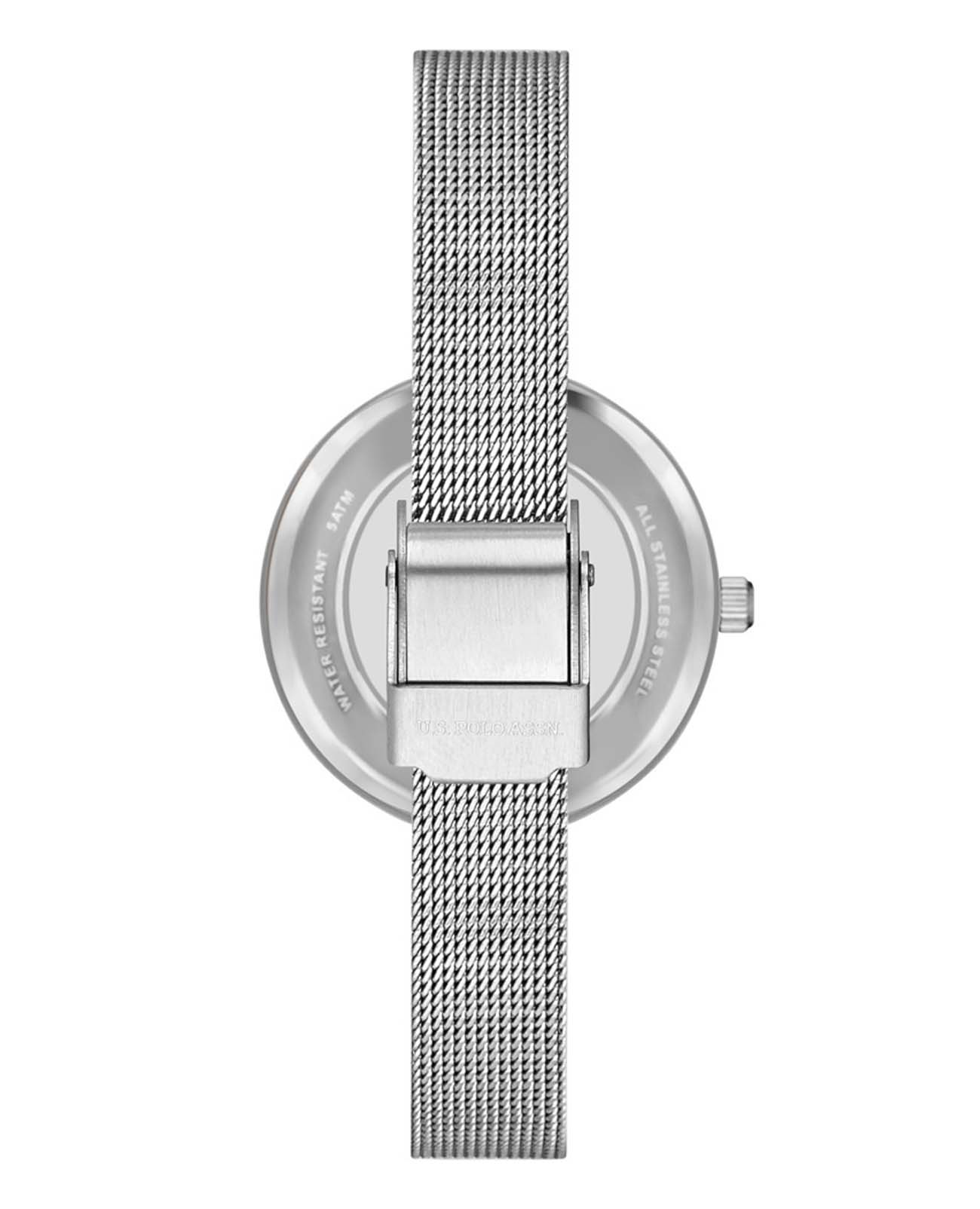 Женские часы U.S. Polo Assn. Stile USPA2025-04, кварцевый механизм с высокой точностью. Минеральное стеклоМинеральное стеклоМинеральное стекло представляет собой искусственно выращенный минерал кварца. Такое стекло отличается особой устойчивостью к повреждениям и царапинам. Уступает по некоторым качествам сапфировому стеклу. устойчивое к появлению царапин, обладающее высокой прозрачностью. Корпус и браслет изготовлены из нержавеющей стали. Циферблат украшен кристаллами. Класс водозащиты: 30 метров, позволит защитить корпус от случайных брызг или капель дождя. Браслет миланского плетения на раскладном замкеРаскладной замокДанный вариант застежки используется только на часах с металлическим браслетом. Отличительная особенность такого крепления в том, что длина браслета становится универсальной и вы можете самостоятельно отрегулировать нужный вам размер – застежка просто двигается по браслету часов.