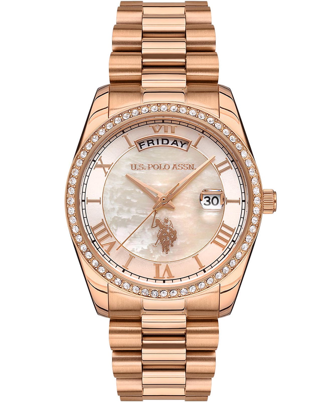 Женские элегантные часы U.S. Polo Assn. Stile USPA2054-01, кварцевый механизм с высокой точностью. Минеральное стеклоМинеральное стеклоМинеральное стекло представляет собой искусственно выращенный минерал кварца. Такое стекло отличается особой устойчивостью к повреждениям и царапинам. Уступает по некоторым качествам сапфировому стеклу. устойчивое к появлению царапин, обладающее высокой прозрачностью. Изысканный корпус изготовлен из нержавеющей стали с IP-покрытиемIP-покрытиеМетод ионного напыления. Демонстрирует повышенную устойчивость к истиранию, окислению и химическим веществам. Под воздействием высокого давления и температуры около 1500°C молекулы металла надёжно соединяются с частицами корпуса часов., а безельБезельВнешний ободок, закрепляющий стекло. В спортивных часах так называется поворотное кольцо с делениями на циферблате, выполняет роль таймера – замеряет отрезки времени на шкале. Неподвижный безель – элемент декора. Однонаправленно вращающийся безель на дайверских часах позволяет фиксировать моменты погружения и выныривания на поверхность. украшен кристаллами. Лаконичные золотистые центральные часовая, минутная и секундная стрелки. Класс водозащиты: 50 метров, позволит защитить корпус от случайных брызг или капель дождя.Часы оснащены люминесцентным покрытиемЛюминесцентное покрытиеПозволяет считывать показания времени в темноте. Производители наносят на стрелки, часовые индексы, безель или поверхность циферблата светонакопительный состав, дающий холодное свечение., обеспечивающим хорошую читаемость в темноте. Стальной браслет с IP-покрытиемIP-покрытиеМетод ионного напыления. Демонстрирует повышенную устойчивость к истиранию, окислению и химическим веществам. Под воздействием высокого давления и температуры около 1500°C молекулы металла надёжно соединяются с частицами корпуса часов. на застёжке-бабочкеЗастёжка "бабочка"Такой вид застёжки дополняется предохранителями, помогающими избежать случайного раскрытия браслета. Обладают изящным исполнением. обеспечивает комфорт и удобство в использовании, добавляя завершающий штрих к этому стильному аксессуару. Циферблат подчёркивает изысканный характер часов, создавая универсальный образ, подходящий как для повседневных ситуаций, так и для особых случаев.