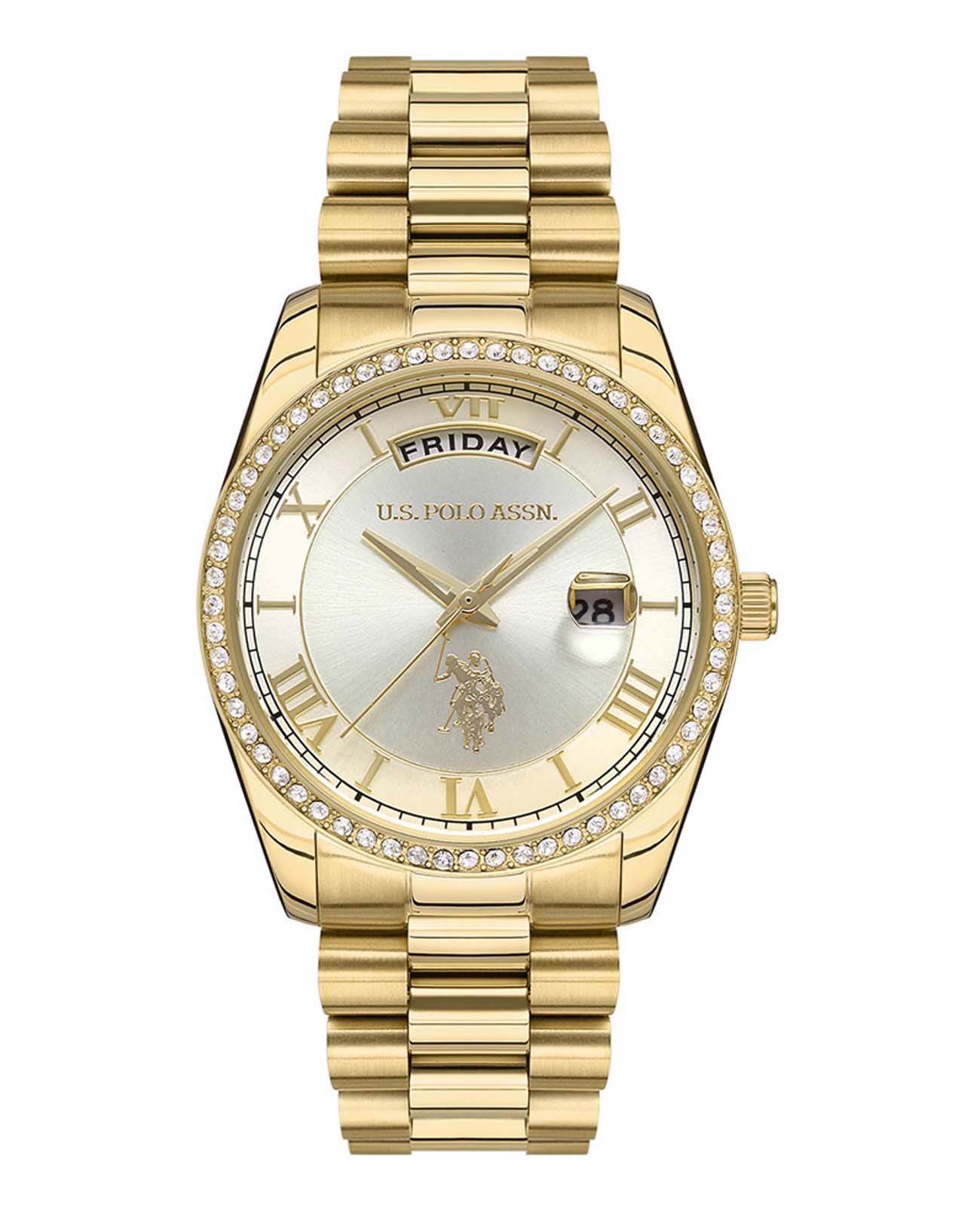Женские часы U.S. Polo Assn Stile USPA2054-03, кварцевый механизм с высокой точностью. Минеральное стеклоМинеральное стеклоМинеральное стекло представляет собой искусственно выращенный минерал кварца. Такое стекло отличается особой устойчивостью к повреждениям и царапинам. Уступает по некоторым качествам сапфировому стеклу. устойчивое к появлению царапин, обладающее высокой прозрачностью. Корпус изготовлен из нержавеющей стали с IP-покрытиемIP-покрытиеМетод ионного напыления. Демонстрирует повышенную устойчивость к истиранию, окислению и химическим веществам. Под воздействием высокого давления и температуры около 1500°C молекулы металла надёжно соединяются с частицами корпуса часов.. БезельБезельВнешний ободок, закрепляющий стекло. В спортивных часах так называется поворотное кольцо с делениями на циферблате, выполняет роль таймера – замеряет отрезки времени на шкале. Неподвижный безель – элемент декора. Однонаправленно вращающийся безель на дайверских часах позволяет фиксировать моменты погружения и выныривания на поверхность. украшен кристаллами. Окошко даты находится в положении 3 часа. Класс водозащиты: 30 метров, позволит защитить корпус от случайных брызг или капель дождя. Стальной браслет с IP-покрытиемIP-покрытиеМетод ионного напыления. Демонстрирует повышенную устойчивость к истиранию, окислению и химическим веществам. Под воздействием высокого давления и температуры около 1500°C молекулы металла надёжно соединяются с частицами корпуса часов. на застёжке-бабочке с кнопкамиЗастёжка "бабочка"Такой вид застёжки дополняется предохранителями, помогающими избежать случайного раскрытия браслета. Обладают изящным исполнением. .