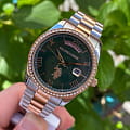 Женские часы U.S. Polo Assn. Stile USPA2054-05, кварцевый механизм с высокой точностью. Минеральное стеклоМинеральное стеклоМинеральное стекло представляет собой искусственно выращенный минерал кварца. Такое стекло отличается особой устойчивостью к повреждениям и царапинам. Уступает по некоторым качествам сапфировому стеклу. устойчивое к появлению царапин, обладающее высокой прозрачностью. Корпус изготовлен из нержавеющей стали. БезельБезельВнешний ободок, закрепляющий стекло. В спортивных часах так называется поворотное кольцо с делениями на циферблате, выполняет роль таймера – замеряет отрезки времени на шкале. Неподвижный безель – элемент декора. Однонаправленно вращающийся безель на дайверских часах позволяет фиксировать моменты погружения и выныривания на поверхность. из нержавеющей стали с IP-покрытиемIP-покрытиеМетод ионного напыления. Демонстрирует повышенную устойчивость к истиранию, окислению и химическим веществам. Под воздействием высокого давления и температуры около 1500°C молекулы металла надёжно соединяются с частицами корпуса часов. и украшен кристаллами. Окошко даты в положении 3 часов, окошко дня недели в положении 12 часов. Класс водозащиты: 30 метров, позволит защитить корпус от случайных брызг или капель дождя. Стальной браслет с частичным IP-покрытиемIP-покрытиеМетод ионного напыления. Демонстрирует повышенную устойчивость к истиранию, окислению и химическим веществам. Под воздействием высокого давления и температуры около 1500°C молекулы металла надёжно соединяются с частицами корпуса часов. на застёжке «бабочка» с кнопкамиЗастёжка "бабочка"Такой вид застёжки дополняется предохранителями, помогающими избежать случайного раскрытия браслета. Обладают изящным исполнением. .