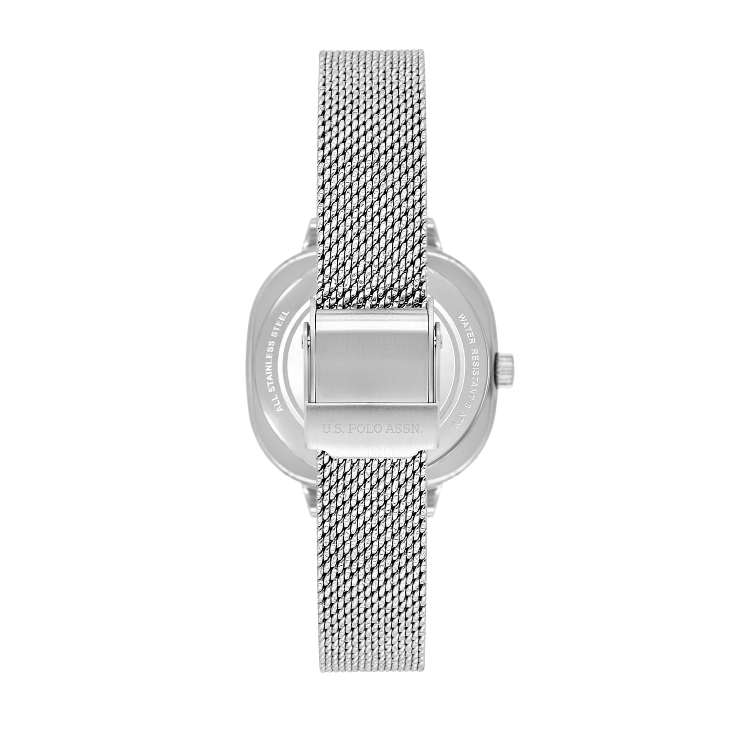 Женские часы U.S. Polo Assn. USPA2087-01 кварцевый механизм с высокой точностью. Минеральное стеклоМинеральное стеклоМинеральное стекло представляет собой искусственно выращенный минерал кварца. Такое стекло отличается особой устойчивостью к повреждениям и царапинам. Уступает по некоторым качествам сапфировому стеклу. устойчивое к появлению царапин, обладающее высокой прозрачностью. Корпус изготовлен из нержавеющей стали. Класс водозащиты: 30 метров, позволит защитить корпус от случайных брызг или капель дождя. Стальной браслет миланского плетения на раскладной застёжкеРаскладная застёжкаТакой тип застёжки используется только на браслетах из металла. Она никогда не раскрывается полностью, происходит разделение на 2 и более частей. Раскладывающая застёжка снизит вероятность потери часов к минимуму.. Неподвижный безельБезельВнешний ободок, закрепляющий стекло. В спортивных часах так называется поворотное кольцо с делениями на циферблате, выполняет роль таймера – замеряет отрезки времени на шкале. Неподвижный безель – элемент декора. Однонаправленно вращающийся безель на дайверских часах позволяет фиксировать моменты погружения и выныривания на поверхность.