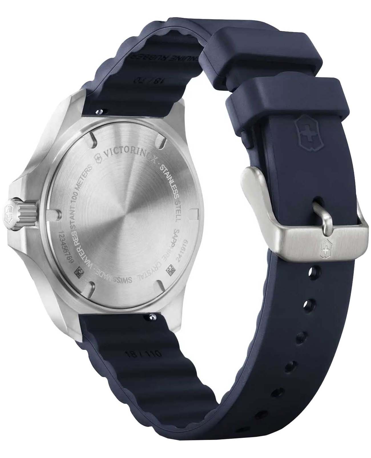 Женские швейцарские часы Victorinox I.N.O.X. V 241919. Сапфировое стеклоСапфировое стеклоПрочный и надёжный материал из кристалла сапфира синтетического происхождения, характеризующийся особой твёрдостью и устойчивостью к царапинам и повреждениям. с трёхслойным антибликовым покрытием. Корпус часов выполнен из нержавеющей стали 316L. Практичный каучуковый ремешок на стандартной застёжке. Влагозащита: 100 метров, позволит плавать, нырять и заниматься другими водными видами спорта. Стрелки и метки с люминесцентным покрытиемЛюминесцентное покрытиеПозволяет считывать показания времени в темноте. Производители наносят на стрелки, часовые индексы, безель или поверхность циферблата светонакопительный состав, дающий холодное свечение.. В комплекте съемный защитный бампер.