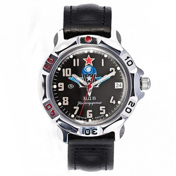 Российские механические часы. Корпус из высокопрочной стали с антикоррозийными свойствами. Ремешок из натуральной кожи черного цвета. Черной фон циферблата с арабскими цифрами и символикой ВДВ. Водонепроницаемость часов составляет 3 ATM. Минеральное стекло, устойчивое к появлению царапин.