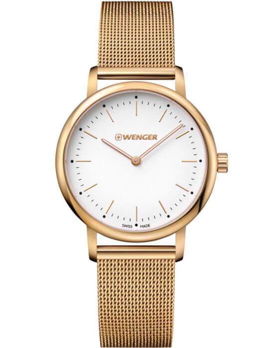 Стильные женские швейцарские часы Wenger 01.1721.113, кварцевый механизм с высокой точностью. Класс водозащиты: 100 метров, позволит плавать, нырять и заниматься другими водными видами спорта. Корпус часов изготовлен из стали, золотистого цвета.